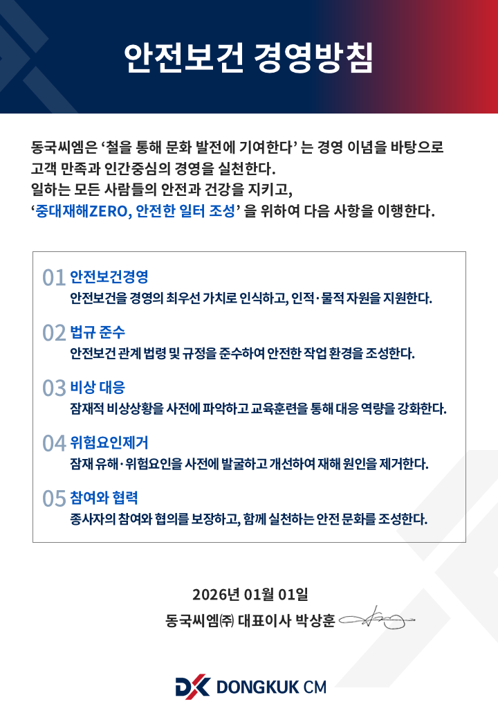 동국씨엠은 전 사 안전보건 전담조직인 안전기획팀을 중심으로 안전보건체계를 구축하고 사고예방활동을 추진하며,